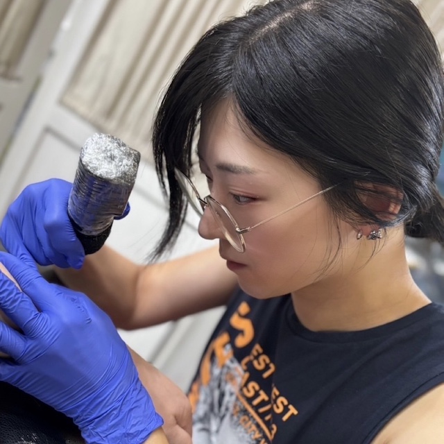 消毒用アルコール、もしくは石鹸等で肌を清潔にして下さい。ニードル付きボトル/専用アプリケーターにジャグアインクを入れ、圧搾しながら肌にデザインを描きます。